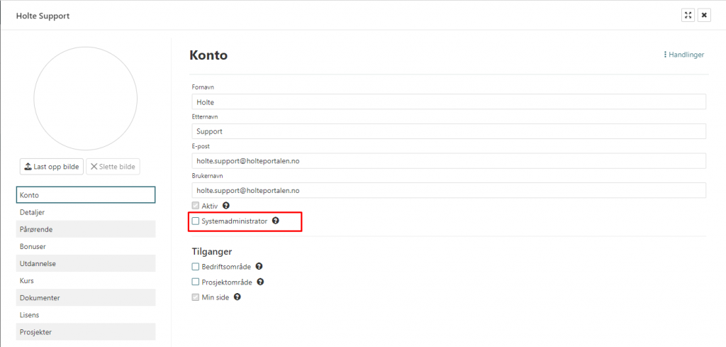 Det høyeste tilgangsnivået du kan ha i HoltePortalen er «Systemadministrator», En systemadministrator har mulighet til å opprette nye brukere, tildele lisenser og endre tilgangen til andre brukere. Som systemadministrator vil du også se alt i de modulene du har lisens på i HoltePortalen. Det vil si alle prosjekter, selv om du ikke er deltager. All informasjon som er lagt inn i personalstyring, alle avvik etc.