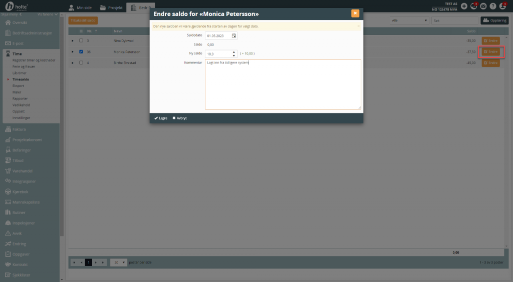 Er det behov for å endre, altså ikke nullstille saldoen, er det også mulig. Marker en ansatt og trykk endre knappen.