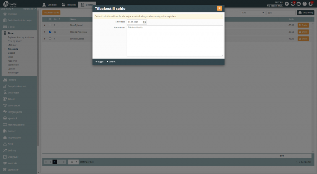 Her er det mulig å tilbakestille eller endre saldoen til en eller flere ansatte. Ved å huke av enten en eller alle ansatte, deretter trykke knappen tilbakestill saldo, vil saldoen nullstille mertiden til ansatte. Husk å velge riktig dato for tilbake stilling av saldo!