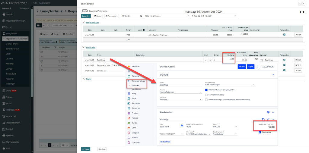 I selve timeføringen og endre detaljer, og legg til kostnad, finner vi kostnader fra Tripletex.