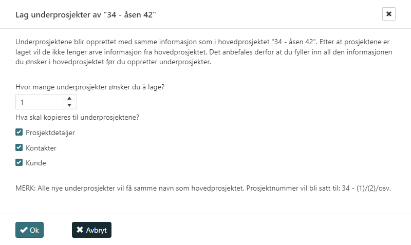 Et underprosjekt kan arve prosjektdetaljer, kontakter og kunde fra hovedprosjektet. Alle underprosjekter vil få samme navn som hovedprosjektet og nesten samme nummer. Prosjektnummer vil bli satt til det prosjektnummeret som hovedprosjektet har også «- (1)/(2)/osv.