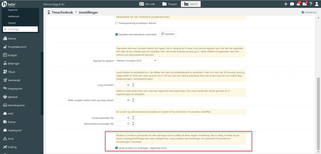 Innstillingen for å skru det på ligger i Bedrift – Time/forbruk – Innstillinger.