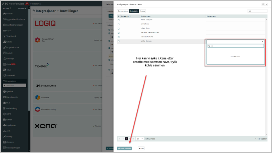 EG Construction Site oppretter ingen ansatte i Xena, så vi må koble sammen ansatte, slik at timer og kostnader blir plassert på riktig ansatt.