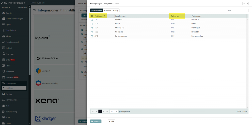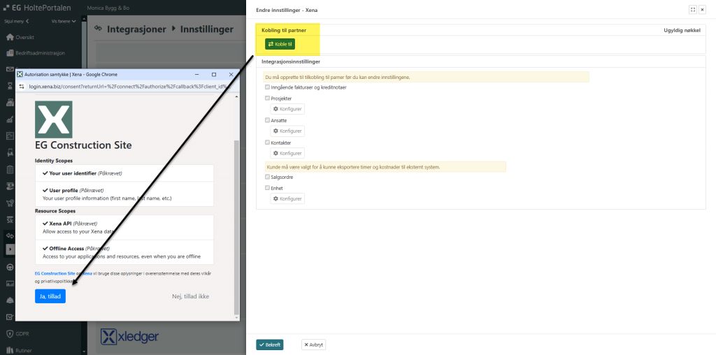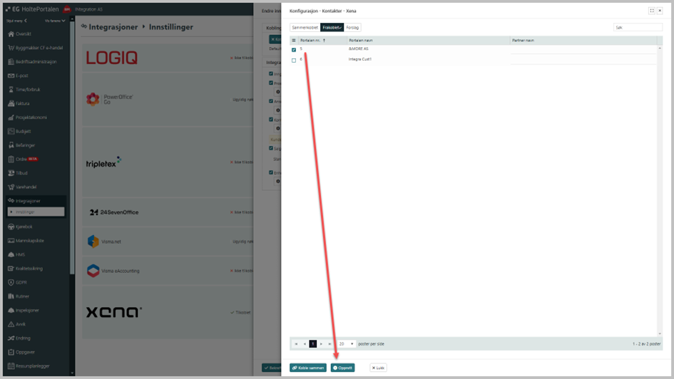I EG HoltePortalen finner du Xena under bedrift – integrasjoner – innstillinger