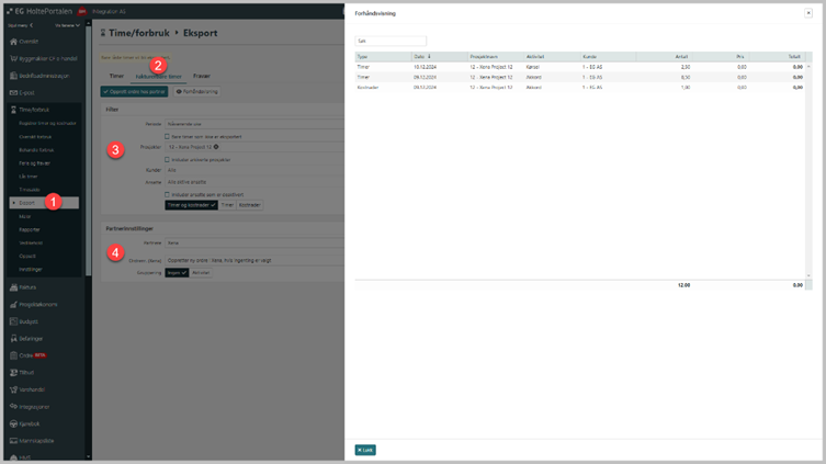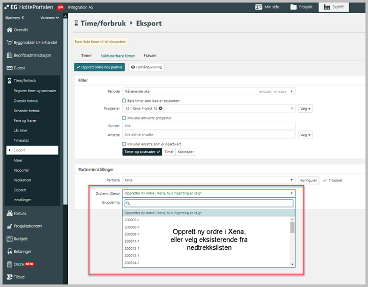 EG Construction Site overfører timer og kostnader som ordrelinjer til Xena. Valget finnes under eksport og fakturerbare timer.