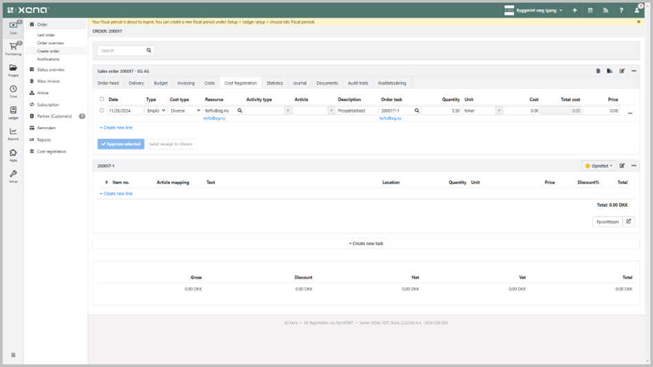 I Xena vil timer og kostnader være å finne under salg -> ordre -> ordreoversikt. Klikk på ordren og deretter fanen som heter kostnadsregistrering